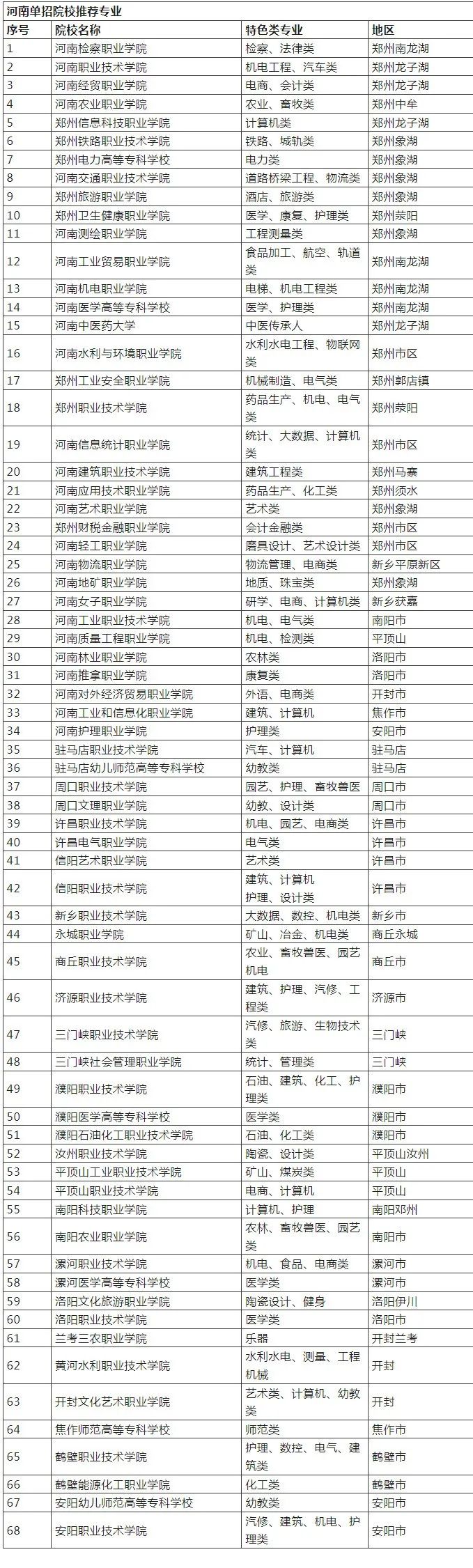 主打?qū)I(yè):軟件工程、移動(dòng)應(yīng)用開發(fā) 安陽(yáng)職業(yè)技術(shù)學(xué)院(安陽(yáng)) 主打?qū)I(yè):飛機(jī)機(jī)電設(shè)備維修、機(jī)電一體化 河南水利與環(huán)境職業(yè)學(xué)院(鄭州) 主打?qū)I(yè):工程造價(jià)、建筑工程技術(shù)水利工程 河南信息統(tǒng)計(jì)職業(yè)學(xué)院(鄭州) 主打?qū)I(yè):統(tǒng)計(jì)與會(huì)計(jì)核查、大數(shù)據(jù)技術(shù) 河南工業(yè)貿(mào)易職業(yè)學(xué)院(鄭州) 主打?qū)I(yè):機(jī)電一體化、汽車檢測(cè)與維修技術(shù) 河南應(yīng)用技術(shù)職業(yè)學(xué)院(鄭州) 主打?qū)I(yè):應(yīng)用化工 藥品生產(chǎn)分析檢驗(yàn)護(hù)理等 河南機(jī)電職業(yè)學(xué)院(鄭州) 主打?qū)I(yè):汽車檢測(cè)與維修技術(shù)、機(jī)電一體化 河南測(cè)繪職業(yè)學(xué)院(鄭州) 主打?qū)I(yè):工程測(cè)量技術(shù)、測(cè)繪工程技術(shù)等 商丘職業(yè)技術(shù)學(xué)院(商丘) 主打?qū)I(yè):汽車檢測(cè)與維修、作物生產(chǎn)、畜牧獸醫(yī) 周口職業(yè)技術(shù)學(xué)院(周口) 主打?qū)I(yè):建筑工程、畜牧獸醫(yī)、應(yīng)用電子技術(shù)等 開封文化藝術(shù)職業(yè)學(xué)院(開封) 主打?qū)I(yè):應(yīng)用化工技術(shù)、旅游管理、視覺傳達(dá) 河南科技職業(yè)大學(xué)(周口) 主打?qū)I(yè):應(yīng)用電子技術(shù)、機(jī)電一體化技術(shù) 鄭州科技學(xué)院(鄭州) 主打?qū)I(yè):計(jì)算機(jī)科學(xué)與技術(shù)、機(jī)械制造與自動(dòng)化 商丘工學(xué)院(商丘) 主打?qū)I(yè):建筑工程技術(shù)、計(jì)算機(jī)、數(shù)控、動(dòng)漫設(shè)計(jì) 鄭州工業(yè)應(yīng)用技術(shù)學(xué)院(鄭州) 主打?qū)I(yè):電氣工程及自動(dòng)化、護(hù)理、機(jī)械設(shè)計(jì) 安陽(yáng)學(xué)院(安陽(yáng)) 主打?qū)I(yè):會(huì)計(jì)學(xué)、計(jì)算機(jī)、英語(yǔ)、 鄭州工商學(xué)院(鄭州) 主打?qū)I(yè):國(guó)際經(jīng)濟(jì)與貿(mào)易、電子信息工程 商丘學(xué)院(商丘) 主打?qū)I(yè):園林、計(jì)算機(jī)、電氣工程、環(huán)境設(shè)計(jì)、英語(yǔ) 鄭州商學(xué)院(鄭州) 主打?qū)I(yè):會(huì)計(jì)學(xué)、商務(wù)英語(yǔ)、工商管理、計(jì)算機(jī)等 河南林業(yè)職業(yè)學(xué)院(洛陽(yáng)) 主打?qū)I(yè):計(jì)算機(jī)網(wǎng)絡(luò)技術(shù)、機(jī)電一體化、園林技術(shù) 漯河職業(yè)技術(shù)學(xué)院(漯河) 主打?qū)I(yè):機(jī)電一體化、食品營(yíng)養(yǎng)與檢測(cè)、新能源 河南質(zhì)量工程職業(yè)學(xué)院(平頂山) 主打?qū)I(yè):機(jī)電一體化、特種加工技術(shù)、 信陽(yáng)職業(yè)技術(shù)學(xué)院(信陽(yáng)) 主打?qū)I(yè):學(xué)前教育、護(hù)理、醫(yī)學(xué)檢驗(yàn) 南陽(yáng)農(nóng)業(yè)職業(yè)學(xué)院(南陽(yáng)) 主打?qū)I(yè):養(yǎng)殖、畜牧獸醫(yī)、園藝技術(shù)
