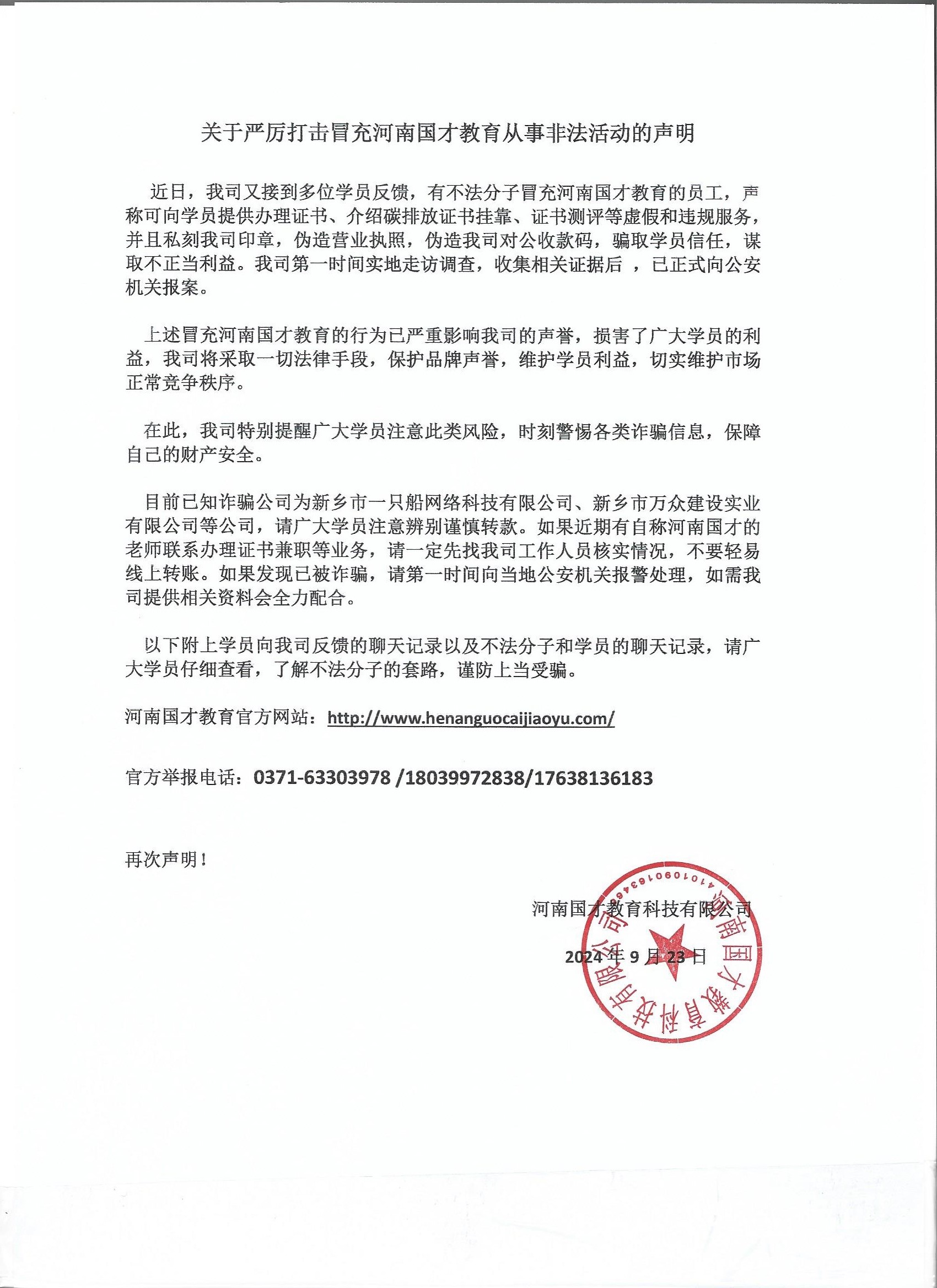 關(guān)于嚴(yán)厲打擊冒充河南國(guó)才教育從事非法活動(dòng)的再次聲明